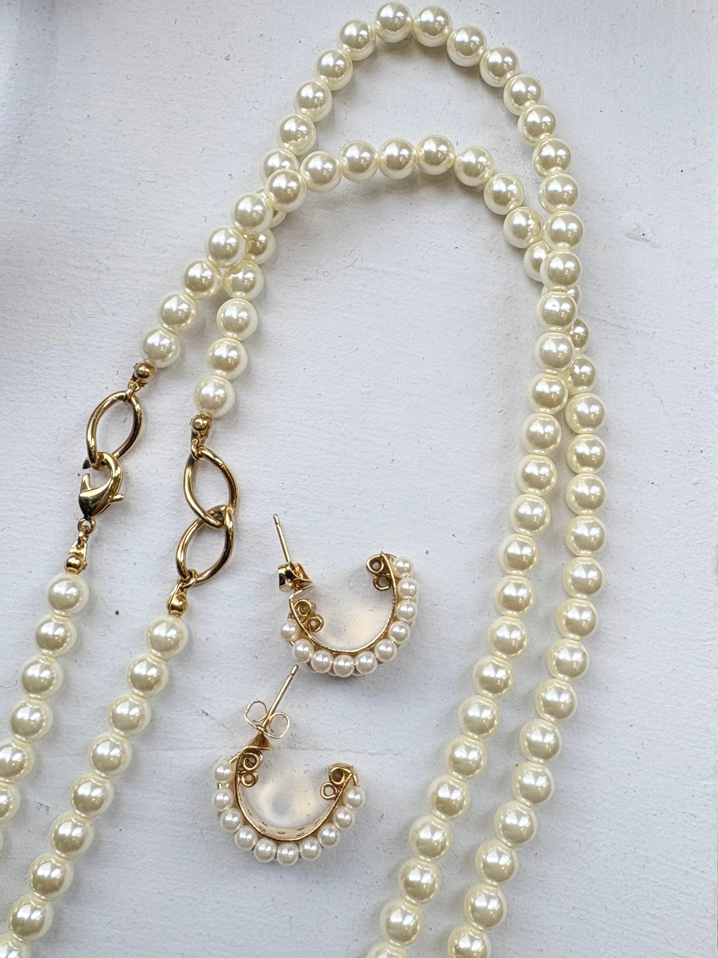 S様専用ページになります。 パールロングネックレス ほんのりクリームなイタリア製のガラスパール 1連と2連どちらも 2箇所にある小さい金具がアクセントに✨ 大体86cmです パール3連ピアス 大きくないけど存在感✨ 金属部分は真鍮です。24金の薄いエレクトロプレート加工をしています。