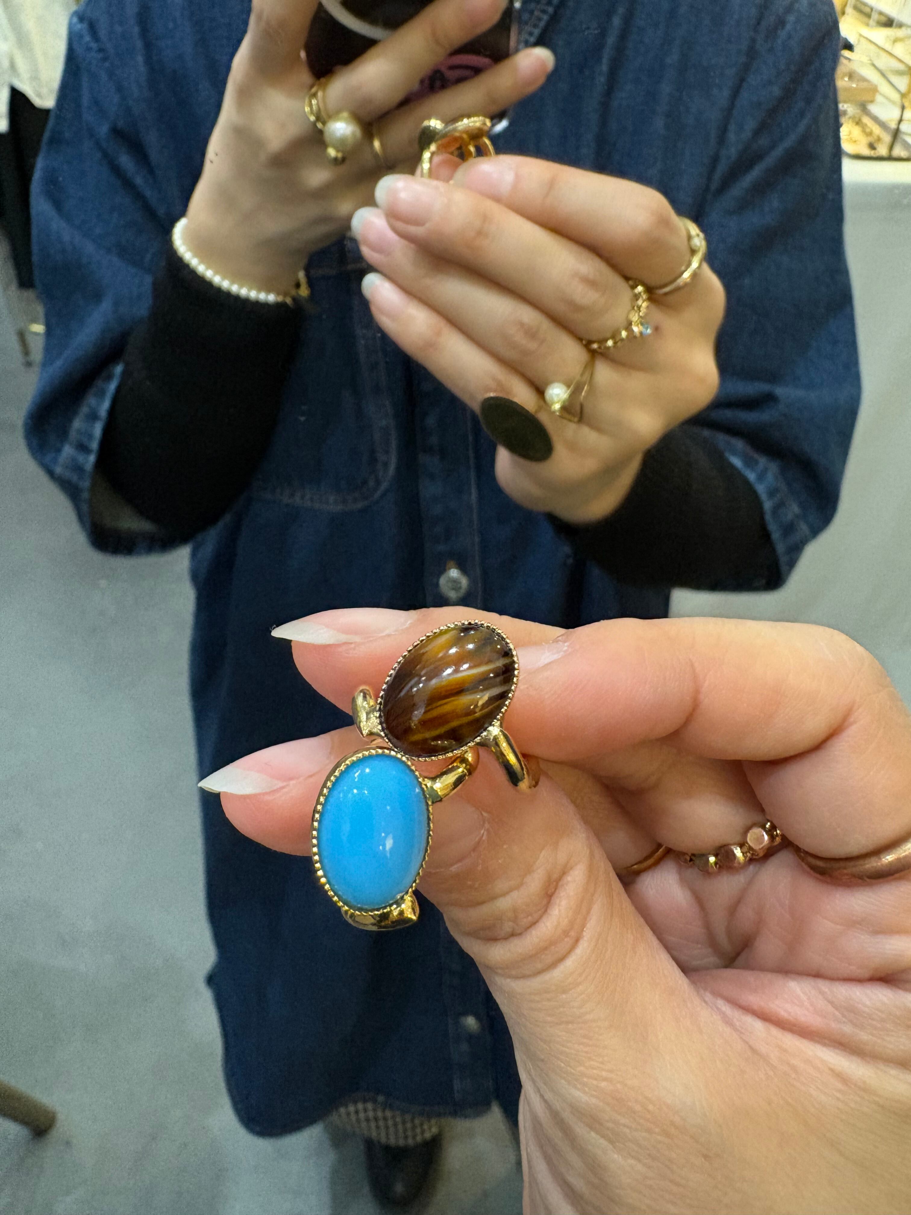 O様専用ページになります。 Câline Paris 1960年頃のヴィンテージパーツリング2点 珈琲豆みたいな模様のリング つるんとして美味しそうな深煎りな色 ターコイズブルーリング つやっとしてるのにマットな色 青とも水色ともいえそうな、そんな曖昧な特別な色 *金属部分の素材は真鍮です。